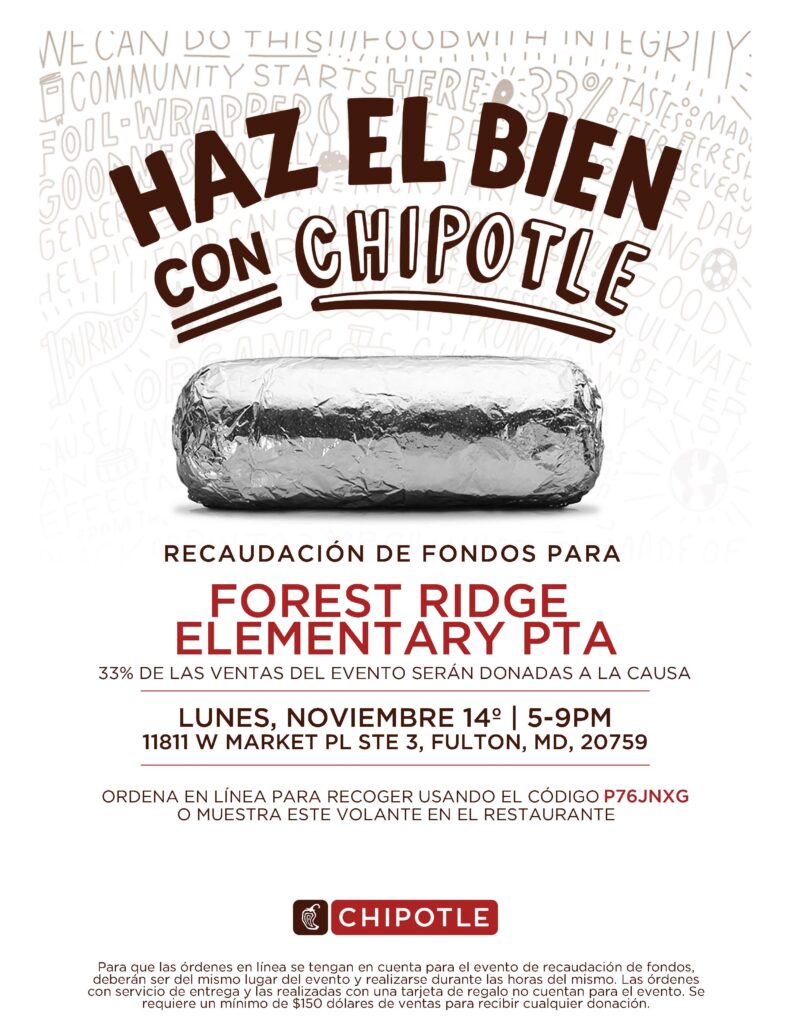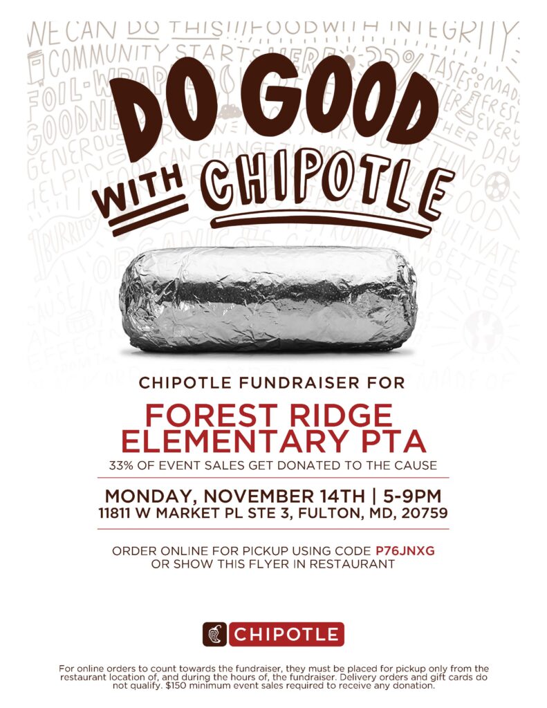 Chipotle Restaurant Night, Nov 14, 5-9 p.m. Liz Horrell November 3, 2022 PTA News Leave a CommentCome support Forest Ridge at the Chipotle in Fulton on Monday, November 14, 2022 from 5-9pm. We get 33% of sales where Forest Ridge is mentioned. Use promo code P76JNXG if ordering online.